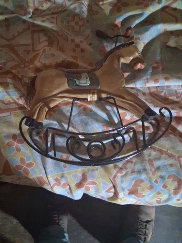 Antique Rocking Horse Wooden Hand Carved & Painted Iron Wheels Leather Saddle