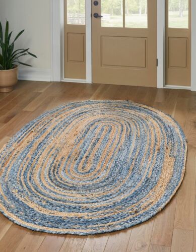 Oval Rug Natural Denim Jute Braided Style Carpet Handmade Rustic Look Area Rug