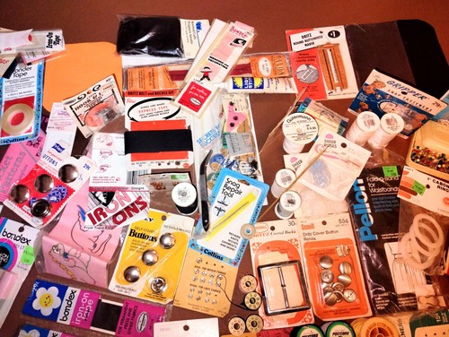 XL lot of VTG sewing supplies thread spools bond buttons buckle Bandex Scovill